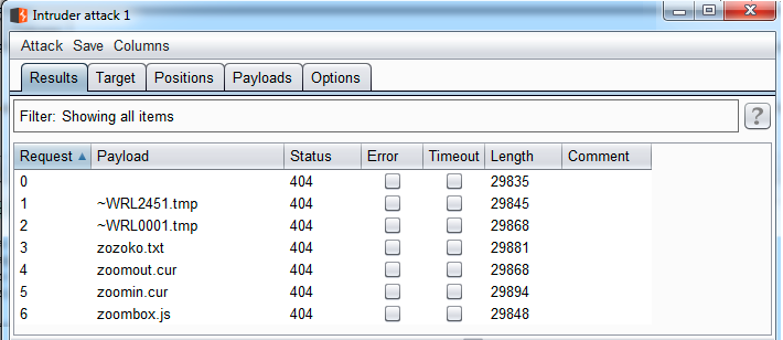 - Launch the Intruder tool's attack and analyze it, looking for an HTTP 200 error code, which means that the file exists. This is a simple way to detect juicy files and paths, without generating a lot of noise (so much traffic) to the application, which could be detected by security controls: