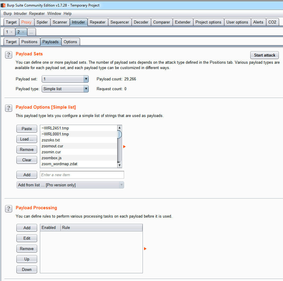 - In the Intruder tool's window, navigate to the Payloads tab, select a file with your most common files list, and click on load: