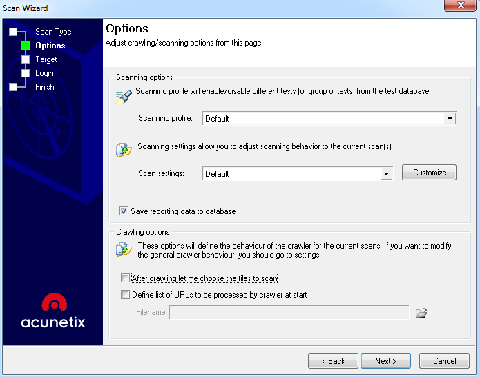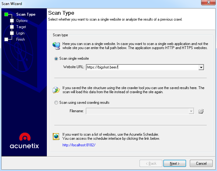 - Acunetix has a wizard to launch the scan. The first window is used to enter the target. You can add an IP address or a domain name: