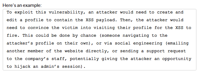 You, as a researcher, need to show the team how likely it is that this vulnerability can pose a significant threat and describe its possible impact. If the exploitation of the vulnerability that you have identified is easy and straightforward, it may be rewarded with a relatively higher bounty but, however, the opposite is also true. If the report contains at least one real-world attack scenario showing that the vulnerability poses a significant threat, the report's value increases.