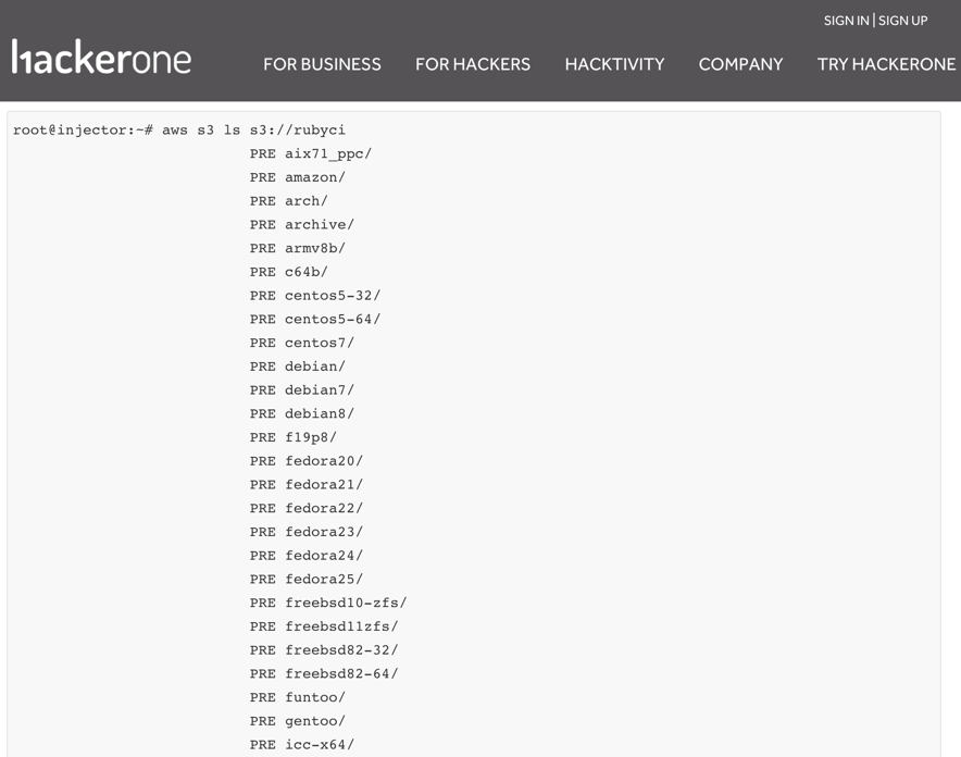 On March 29th, 2017, a bug bounty hunter called InjectorPCA reported gaining access to the Amazon S3 buckets, which are used by HackerOne.