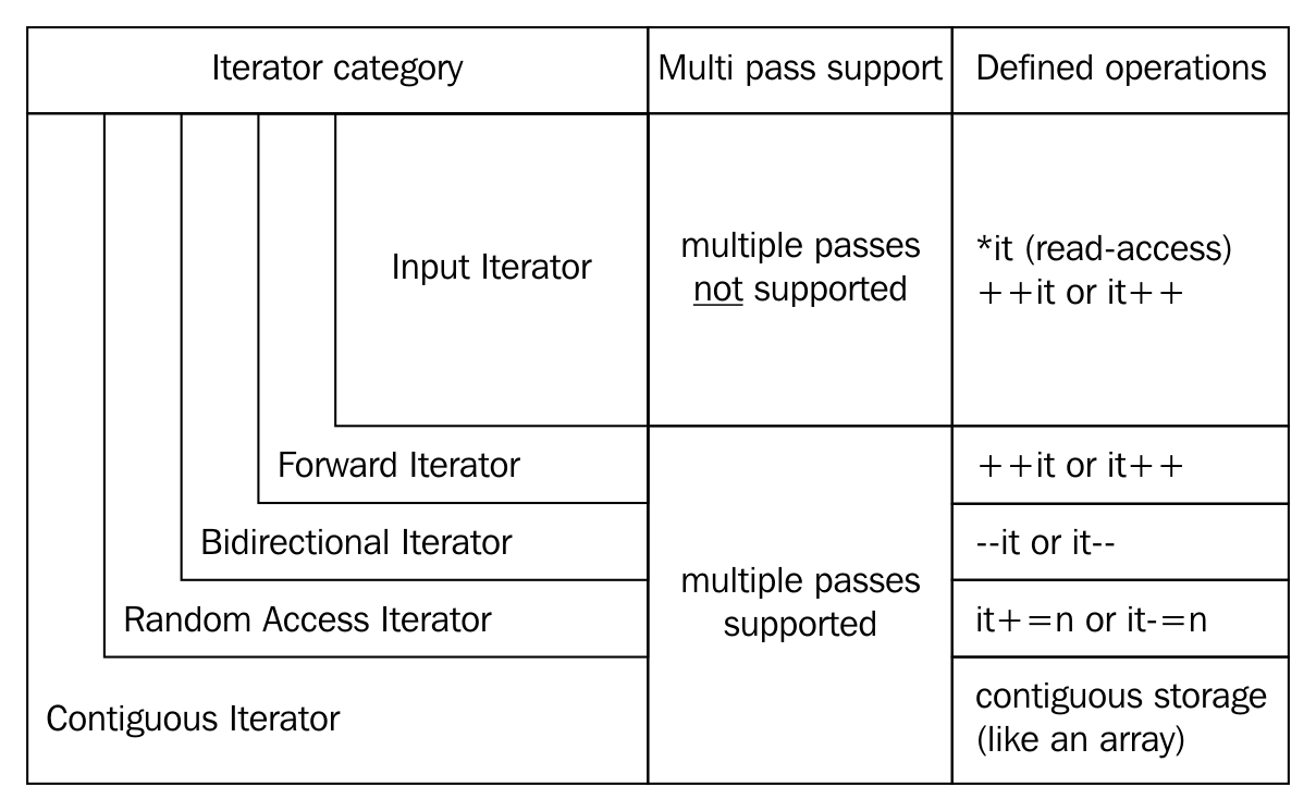 The STL broadly supports the following five types of iterators: