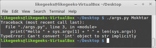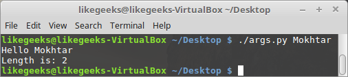 Executing the code as we have earlier, we can see that we have supplied two arguments—the script name and then the string Mokhtar: