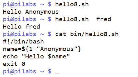 The hello8.sh script provides the functionality that we need, with the logic built directly into the parameter assignment. The logic and assignment are now a single line of code within the script and this is a major step in keeping the script simple and maintaining the readability.