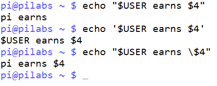 $ echo "$USER earns $4" $ echo '$USER earns $4' $ echo "$USER earns \$4"