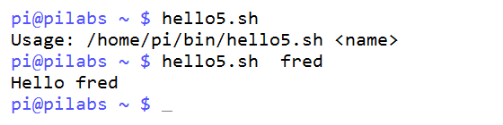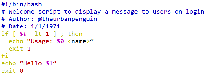#!/bin/bash # Welcome script to display a message to users on login # Author: @theurbanpenguin # Date: 1/1/1971 if [ $# -lt 1 ] ; then echo "Usage: $0 <name>" exit 1 fi echo "Hello $1" exit 0