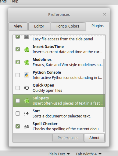 Another very useful feature is found on the Preferences | Plugins tab. Here, we can enable the Snippets plugin, which can be used to insert code samples. This is shown in the following screenshot:
