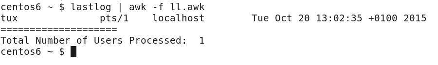 We may also want to count the number of rows returned by the filter. For example, using the internal NR variable will show all rows and not just matched rows; for us to be able to report the number of users that have logged in, we must use our own variable. The following code will maintain the count within the variable that we name cnt. We increment this using the C style ++ for each iteration of the main code block.