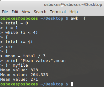 The while loop iterates over the fields; we get the mean value for every row and print it.