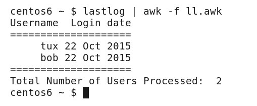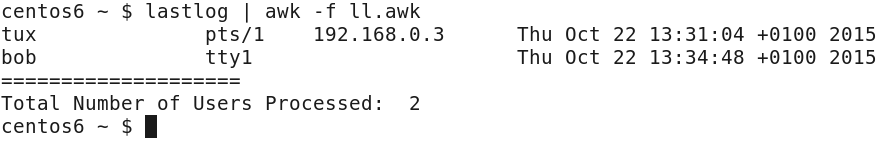 If a user logs onto the server's physical console directly rather than logging on through a remote or graphical pseudo-terminal, then the lastlog output will not display the host field. To demonstrate this, I have logged on to my CentOS host directly to the tty1 console and avoided the GUI. The output from the previous AWK control file shows that we now have the users tux and bob; bob though lacks the host field as he is connected to a console: