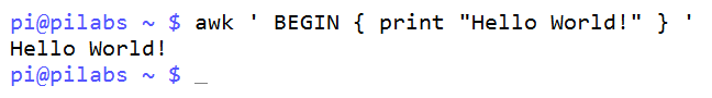 To demonstrate the programming language that is provided with awk, we should create a Hello World program. We know this is compulsory for all languages: