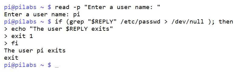 $ bash $ read -p "Enter a user name: " $ if (grep "$REPLY" /etc/passwd > /dev/null) ; then > echo "The user $REPLY exists" > exit 1 > fi