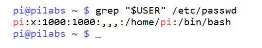 The local user account database in Linux is the /etc/passwd file and this is readable by all user accounts. If we want to search for the line that contains our own data, we can use either our own login name in the search or use parameter expansion and the $USER variable. We can see this in the following command example:
