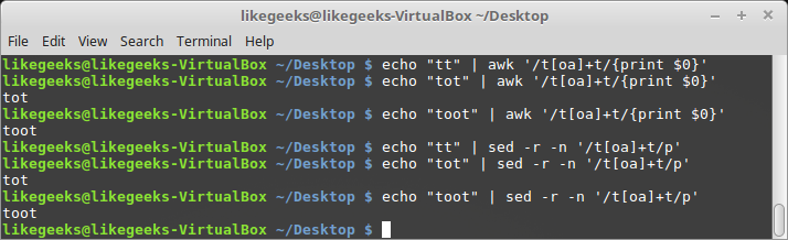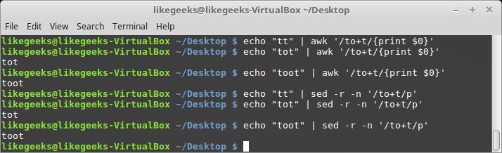 $ echo "toot" | awk '/to+t/{print $0}'