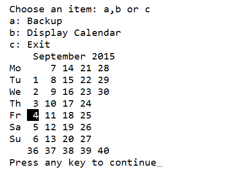 As we can see, we still maintain the simplicity of the case statement; however, we can develop the script to add in more complexity through the functions. For example, when choosing option b for the calendar, we now check to see whether the ncal command is available. If it is, we use ncal and use the -w option to print the week number. We can see this in the following screenshot, where we have chosen to display the calendar and install ncal: