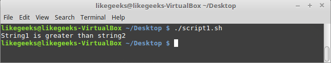 #!/bin/bash if [ "mokhtar" \> "Mokhtar" ] then echo "String1 is greater than string2" else echo "String1 is less than the string2" fi