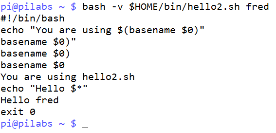 If we want to look at the verbose output from our script and the detailed information about the way the script is evaluated line by line, we can use the -v option. This can be within the shebang, but it is often easier to run the script directly with bash: