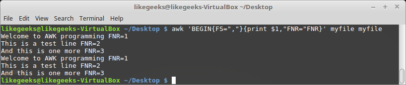 Here we processed the file twice for testing purposes only to see what the value of the FNR variable is.
