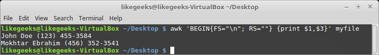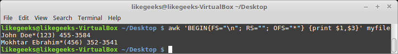 We can say that we have two records for two persons and each record contains three fields. Let's assume that we need to print the name and the phone number. So how do we make AWK process them correctly?