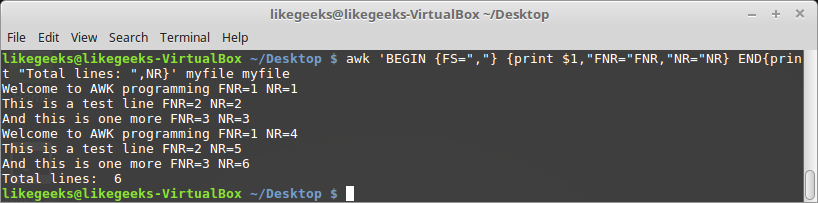 We know that NR holds the number of the processed line and FNR looks the same from the definition, but let's explore the following example to see the difference: