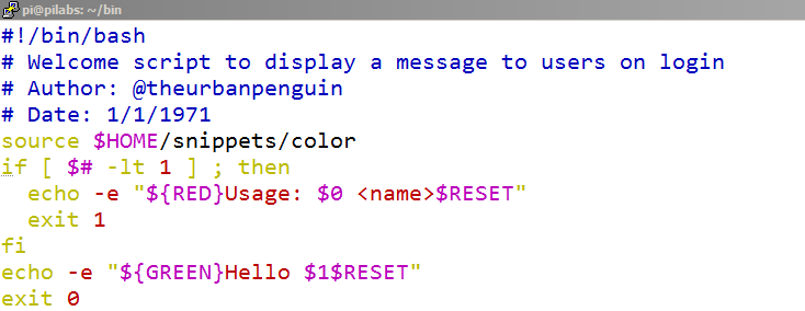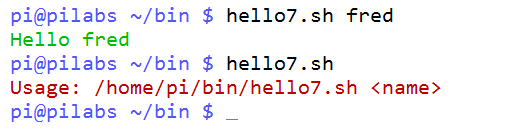 We can easily identify the success and failure of the script through the color-coded output; the green Hello fred where we supply the parameter, and the red Usage statement where we have not provided the required name.