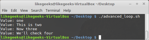 #!/bin/bash for var in one "This is two" "Now three" "We'll check four" do echo "Value: $var" done