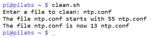 We have provided two functions within the script. The first, is_file, simply tests to ensure that the filename we have entered is a regular file. Then we declare the clean_file function with a little added functionality, displaying the line count of the file before and after the operation. We can also see that functions can be nested and we call the is_file function with clean_file.
