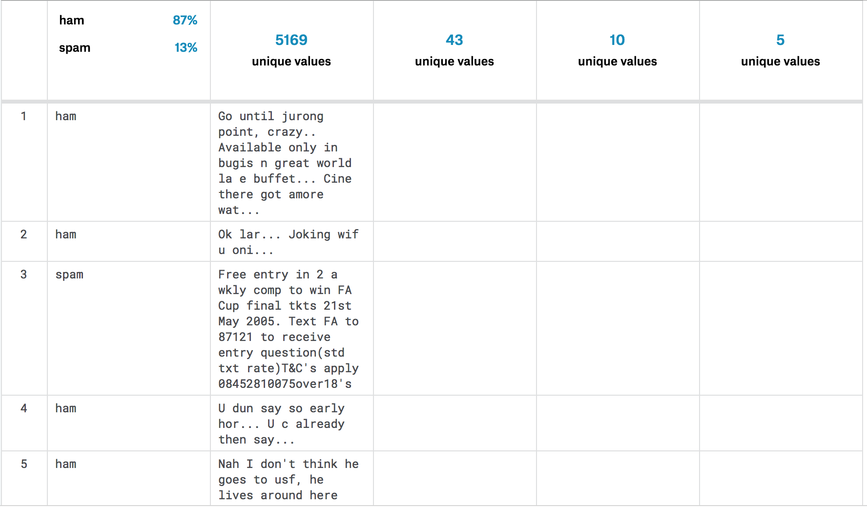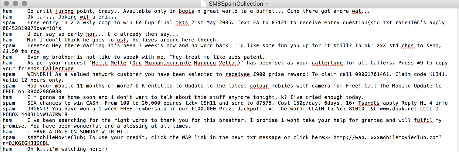 dataframe = pd.read_csv('SMSSpamCollectionDataSet', delimiter='\t',header=None)