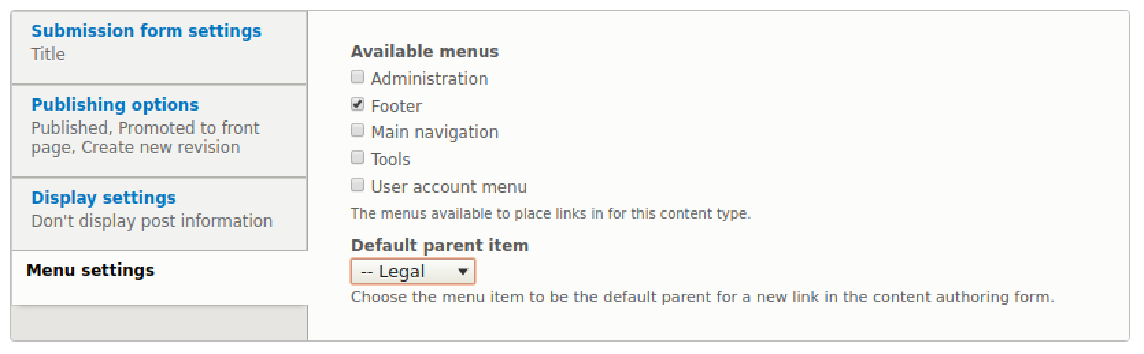 Sometimes, it is desirable to add a piece of content to a menu, particularly if it is somewhat static on the site. For example, Terms and Conditions would be persistent site content, whereas a notice about the current week's activities would not. The former might be one of a specific content type, perhaps Legal, and you might desire that every piece of such content be listed in the Footer menu. In this example, the Footer within the list of Available menus would be checked, and if there were a heading, Legal, already in that menu, it could be selected as the Default parent item. In that case, all content of that type would, by default, be added to the Footer menu as child content to Legal: