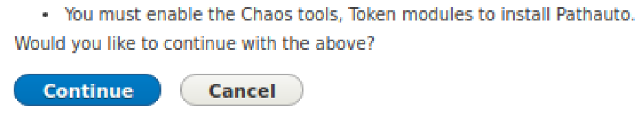 If you do receive this message, or a similar one when you are installing a module, it is because the module is dependent on other modules, and one or more of them isn't enabled. If the necessary modules are present, Drupal will offer to enable them as well. Simply click Continue. In this case, if all goes well, you will receive a status message at the top of the reloaded page stating that three modules have been enabled: pathauto, Chaos tools, and Token.