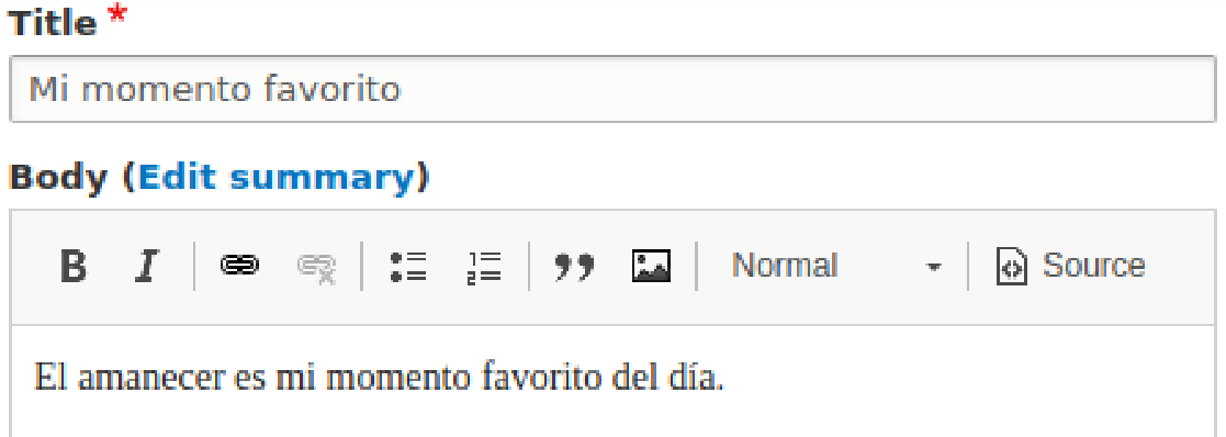 In this section, we'll create a short new article to use for our example. Navigate to /node/create/article. For my title, I'll enter My Favorite Time. For the body, I've put Dawn is my favorite time of the day. Note that below the Body text field there is a language selector. Since it is defaulting to English, I'll leave it unchanged and save my article. If you still have Content moderation active, don't forget to save your article as Published rather than Draft.