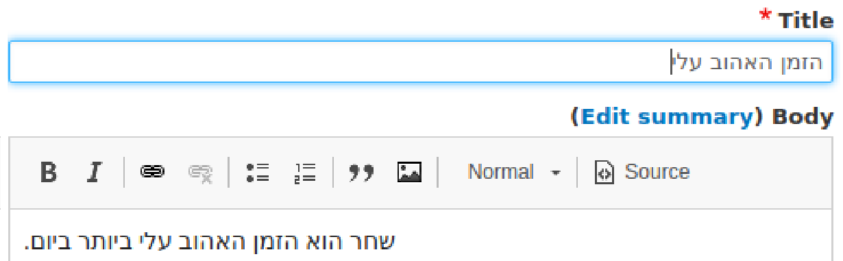 Having saved this translation, the translation list for my content now shows Español, with its translated title, as being published. Next, I'll create a Hebrew translation and save it. The content edit form looks different, because with a right-to-left language, the text fields appear on the right and the metadata fields on the left: