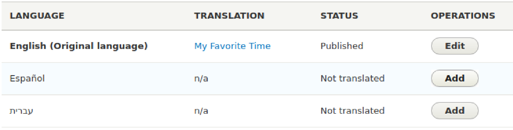 Each piece of content will have rows corresponding to each configured language. The status column identifies whether the content has been translated to that language. If it has, there will be an Edit button. If not, there will be an Add button. I'll click Add in the row for the Spanish translation.