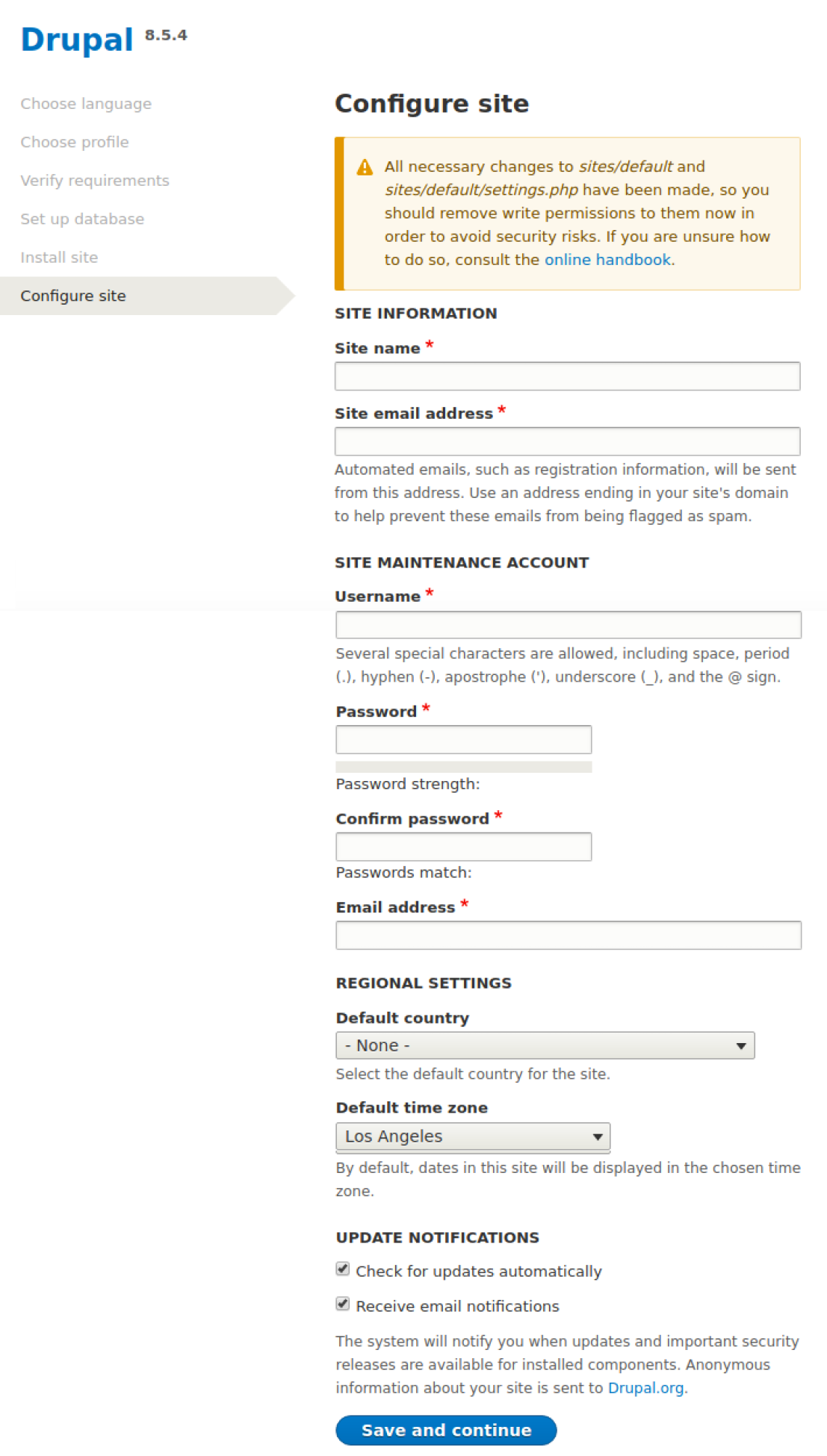 An installation profile is a configuration or collection of settings and software that's predetermined to be used for a specific purpose. Currently, Drupal has only three available in a normal installation: Standard, Minimal, and Unami, with Standard being the default setting, and the one we want. From here, click the Save and continue button.