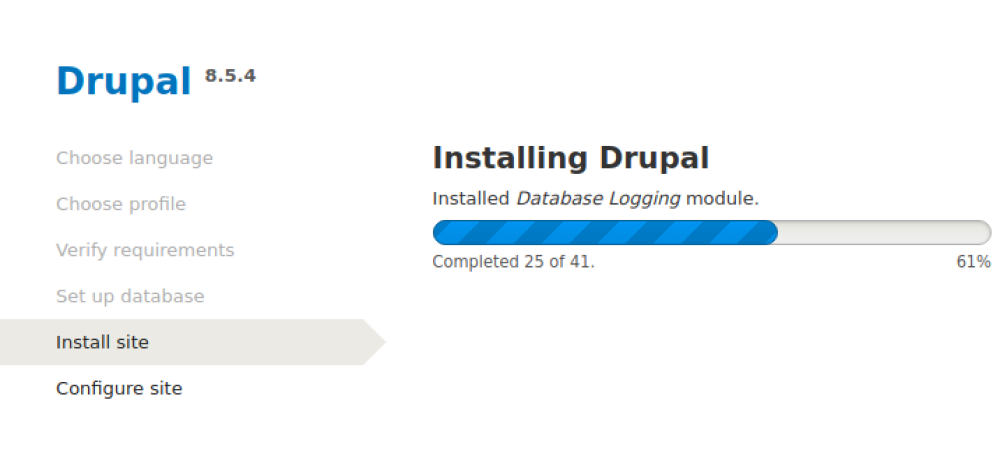 At this point, Drupal will begin installing itself, entering configuration information into the database and initializing data structures. A meter will keep you informed of its progress, as shown in the following screenshot:
