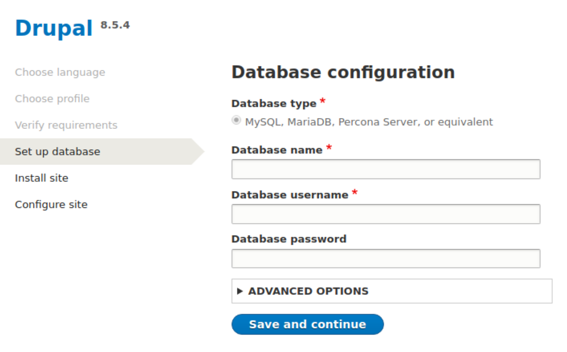 It's time to make use of the database credentials that you obtained. In the text boxes provided, enter the database name, database username, and database password, and then click the Save and continue button.