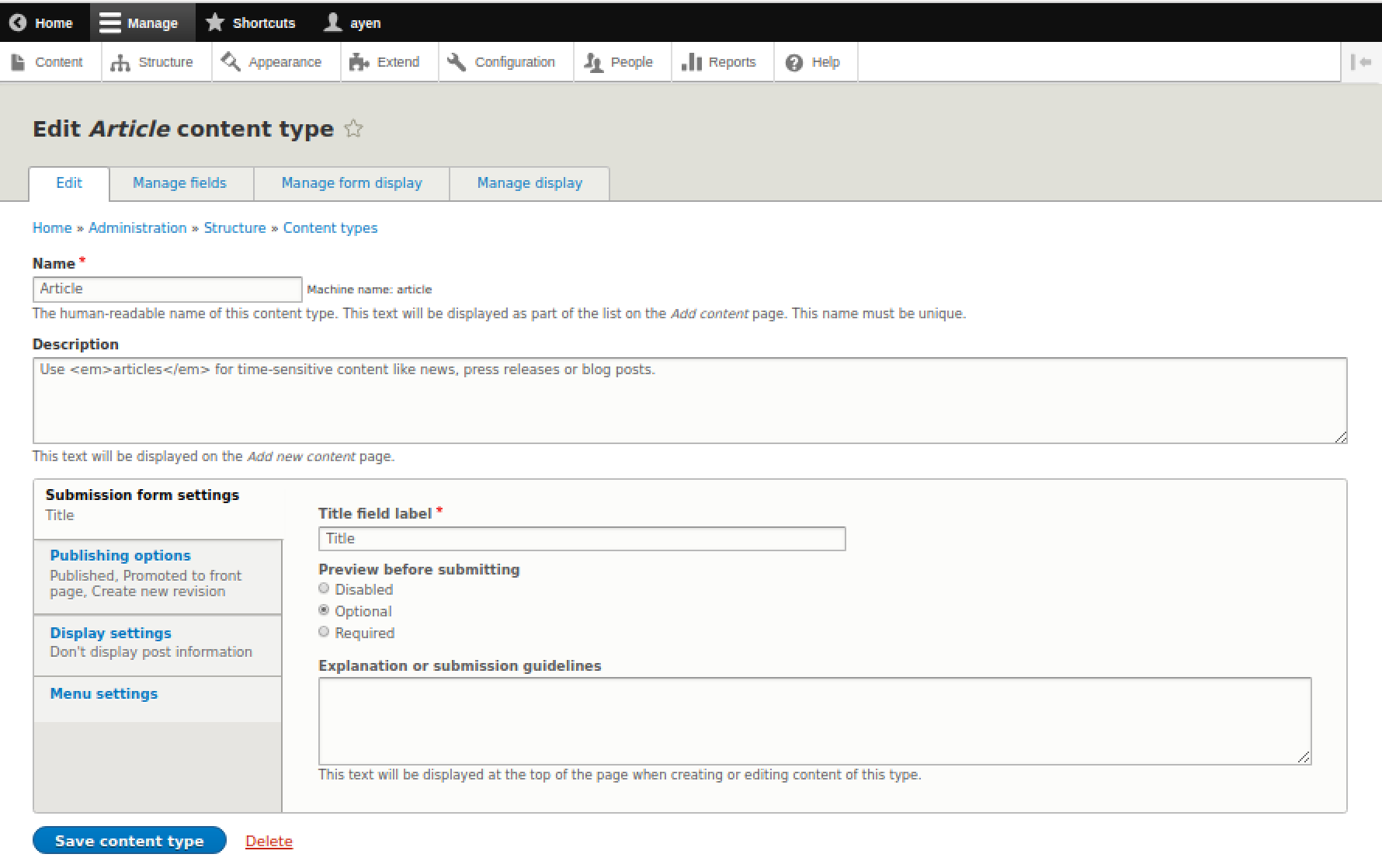 - Name: This is the plain language name that the content type will be identified with. In this case, this is Article. To the right of this human-readable name is what is referred to as the Machine name, which is the internal name. This is generated automatically by Drupal, and is usually the lowercase version of the name, with multiple words having spaces replaced by an underscore.