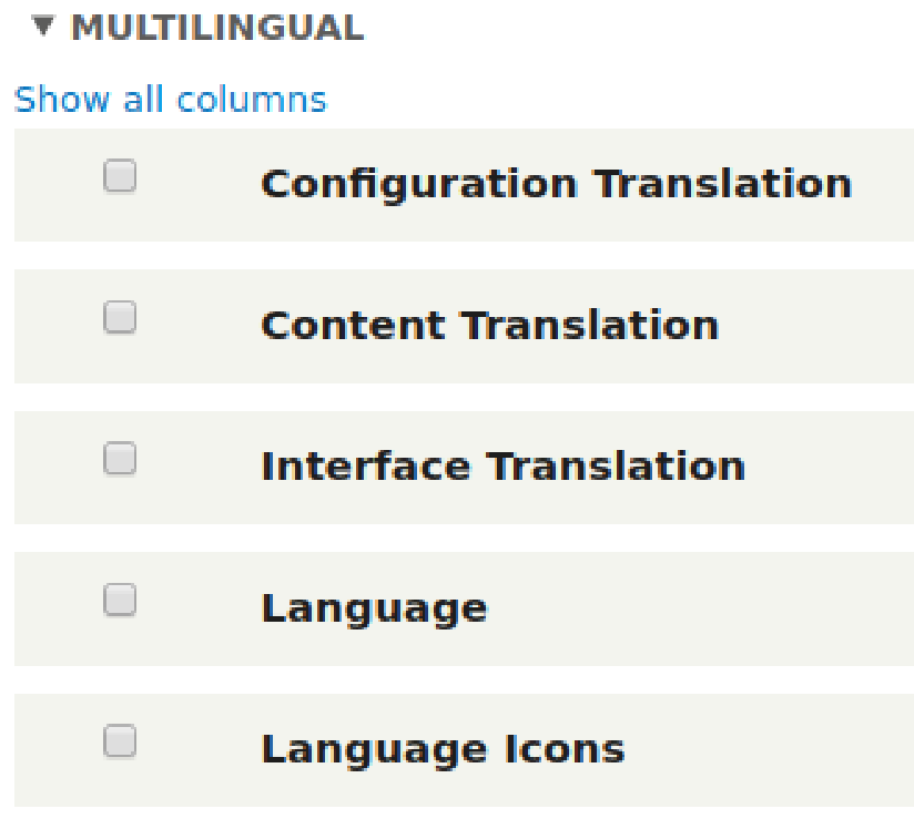When Drupal is installed, the installer selects a default language for the site. In most cases, that language is English. What if there are other languages spoken within our target market? What if our country has more than one official language, or unofficial languages, or English isn't either? The site can be configured to support additional languages, and that is what we must do in order to be able to take advantage of internationalization. To get started, navigate to the Extend page (/admin/modules).