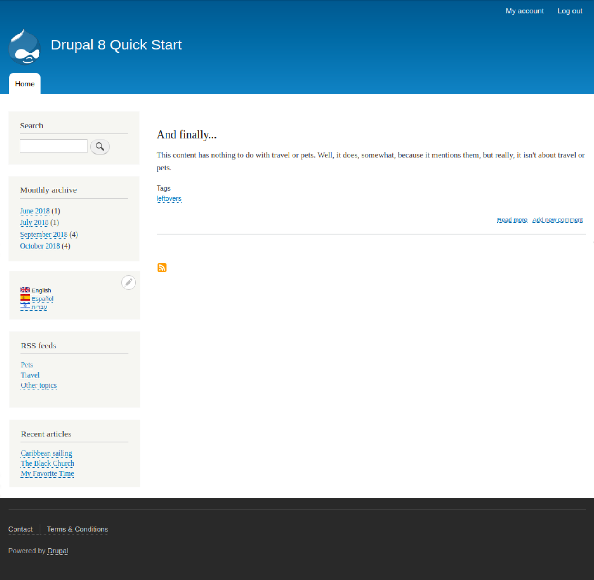 We want to fix the Legal link. One of the things we need to fix is that it is currently linking to the home page rather than a Terms and Conditions page. Drupal will not allow a path to be specified for the menu item unless the path already exists. Therefore, we need to create a Terms and Conditions page first.