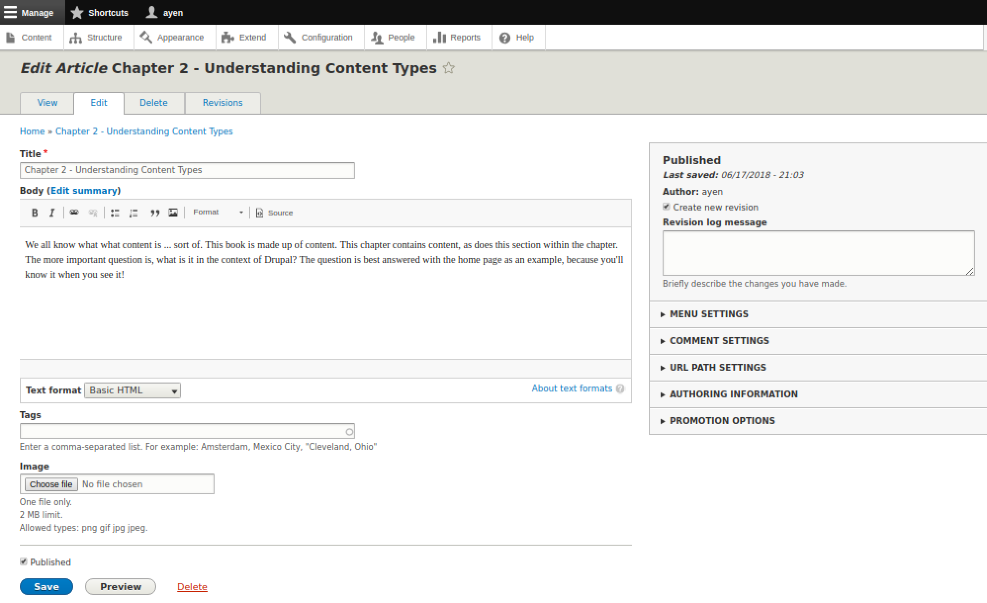 You can see the same content in this form as you did on the page. However, here you also see the fields that hold that content. The content title is in a field labeled Title, and the main text is in a field labeled Body. There are two additional fields that are not being used by this particular piece of content: a field for categories, labeled Tags, and one that is used for attaching an image to the content, labeled Image.