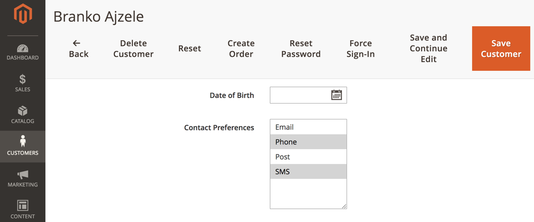 We are instructing Magento to create a multiselect type of attribute. The attribute becomes visible under the Magento admin area, with a customer editing screen as follows: