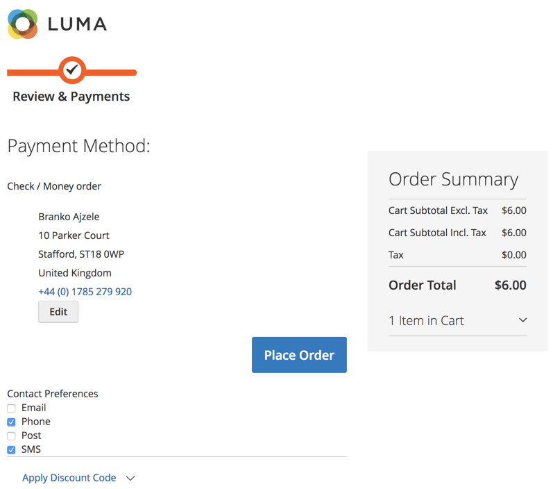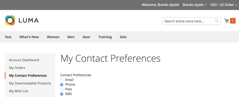 By contrast, the customer's checkout area would show contact preferences, as follows: