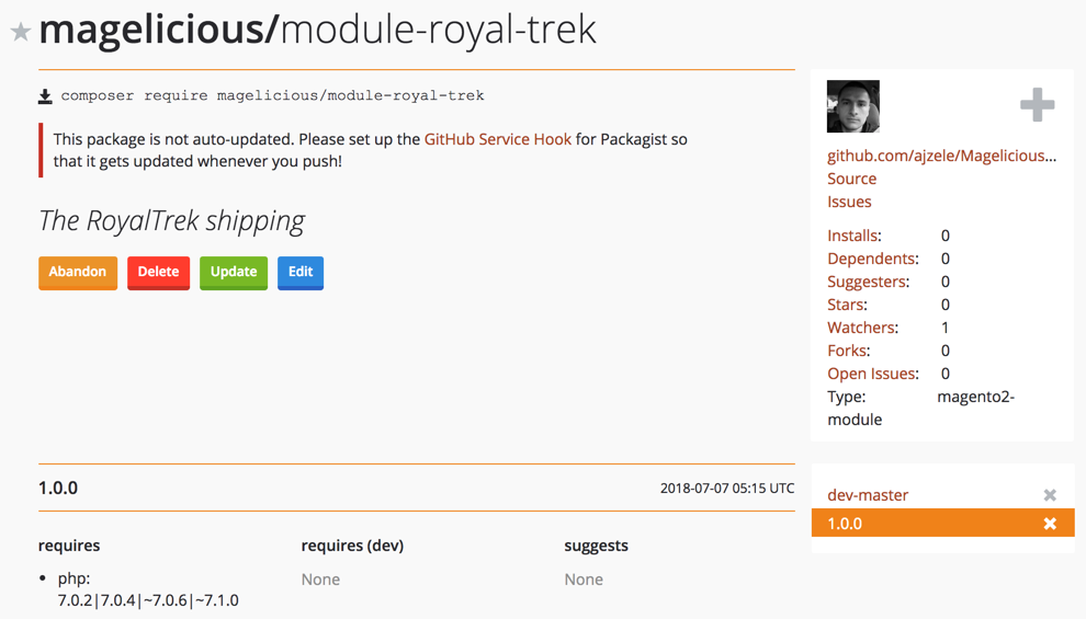 Once we have done that, we can go back to the Packagist package screen and hit the Update button. This should now show our 1.0.0 version: