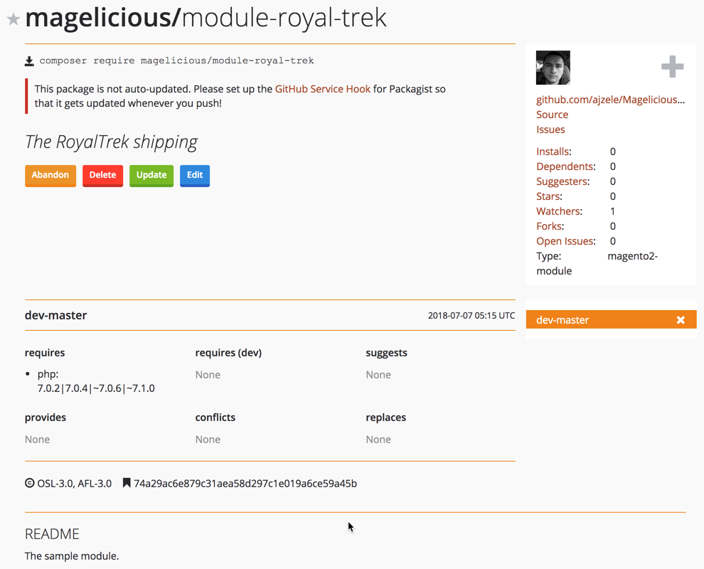 Notice the dev-master label on our Packagist screen. Our branches automatically appear as dev versions in Packagist. Therefore, we can use the composer require magelicious/module-royal-trek:dev-master command to fetch the package. To change that, we need to specifically tag our git commits, as follows: