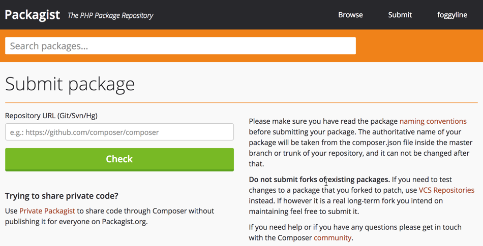 Pushing our Magento module to Packagist is quite easy. Assuming we have our account created, we should start by clicking on the Submit button, which will land us on the following screen: