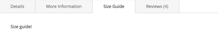 We have been asked to add a functionality that shows the size guide on a product view page. This is to appear as a new tab next to the existing Details, More Information, and Reviews tabs. The content of the size guide tab is to be the same for all products containing the size attribute. We also need it to be editable from Magento admin.