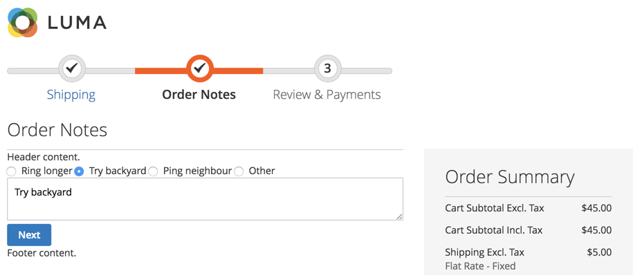 Chapter 8, Customizing Checkout Experience, demonstrates writing a small but functional order notes module. This will allow us to familiarize ourselves with an important aspect of customizing the checkout experience, the gist of which lies in understanding the checkout_index_index layout handle, the JavaScript window.checkoutConfig object, and uiComponent.