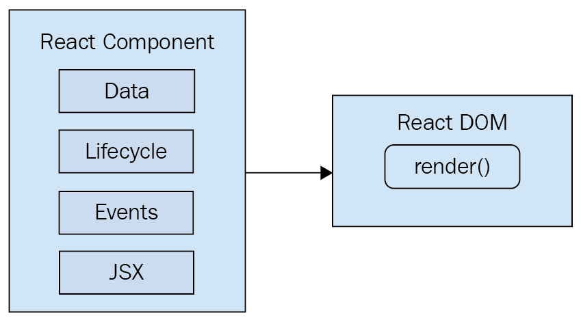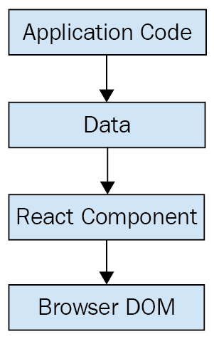 This is literally all there is to React—the core concept. Of course there will be subtle variations to this theme as we make our way through the book, but the flow is more or less the same. We have some application logic that generates some data. We want to render this data to the UI, so we pass it to a React component, which handles the job of getting the HTML into the page.